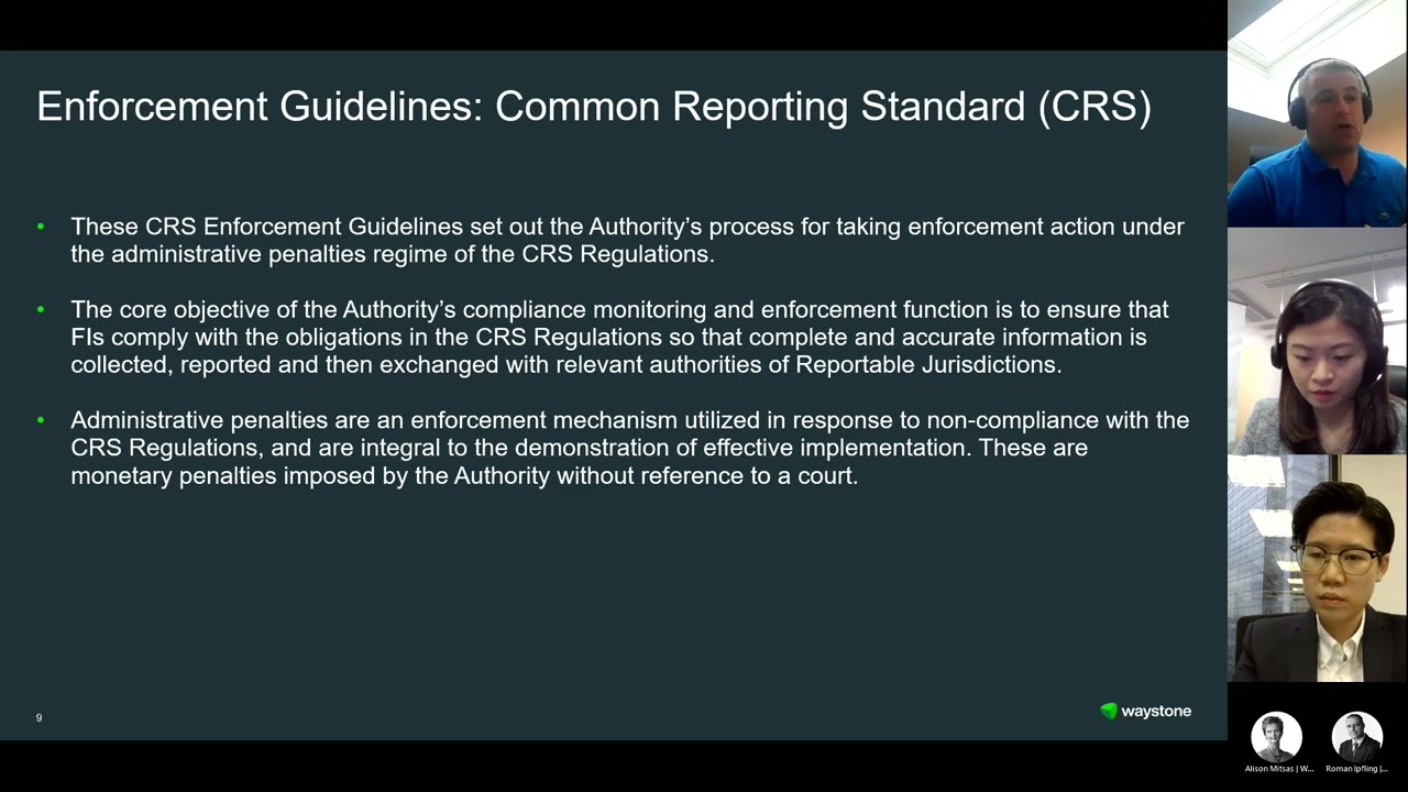 As a lot of our attendees here might be aware the Cayman tax information of RRT recently released a common reporting standard enforcement guideline in March. It outlined the circumstances under which the financial institution could face penalties for failing to comply with the CRS requirements. Roman, since there are field-related reporting deadlines coming up, I thought it might be useful for you to share with our audience here just to give a quick recap of the key requirements and deadlines, and also provide some key points of the CRS enforcement guidelines issued by the Cayman TIA. Roman, over to you.